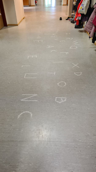 Statt zu schreiben hüpft ein Schüler auf den passenden Buchstaben. Und so manch einer kann schon ganze Wörter hüpfen. Das erfordert natürlich viel Konzentration.